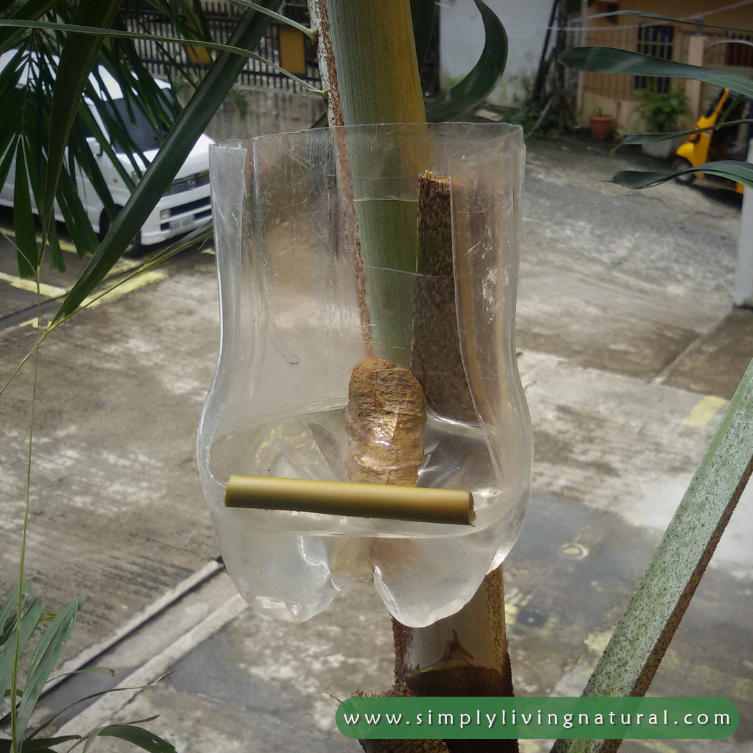 Wir haben uns dazu entschieden eine Plastikflasche in eine Vogeltränke zu verwandeln. Dies geht kinderleicht, zuerst halbiert man eine Flasche mit einem scharfen Messer und spart vorne eine Öffnung aus. Anschließend auf der Rückseite noch einen Schlitz für die Aufhängung einritzen, für einen sicheren Stand haben wir die Konstruktion vorne um einen ca. fingerdickes Bambusholz ergänzt und abschließend nach erfolgreicher Aufhängung mit Wasser befüllt. Bitte nicht vergessen ein Stöckchen oder einen Stein mit in die Tränke zu legen, damit Insekten eine Chance haben sich aus dem Wasser zu befreien.